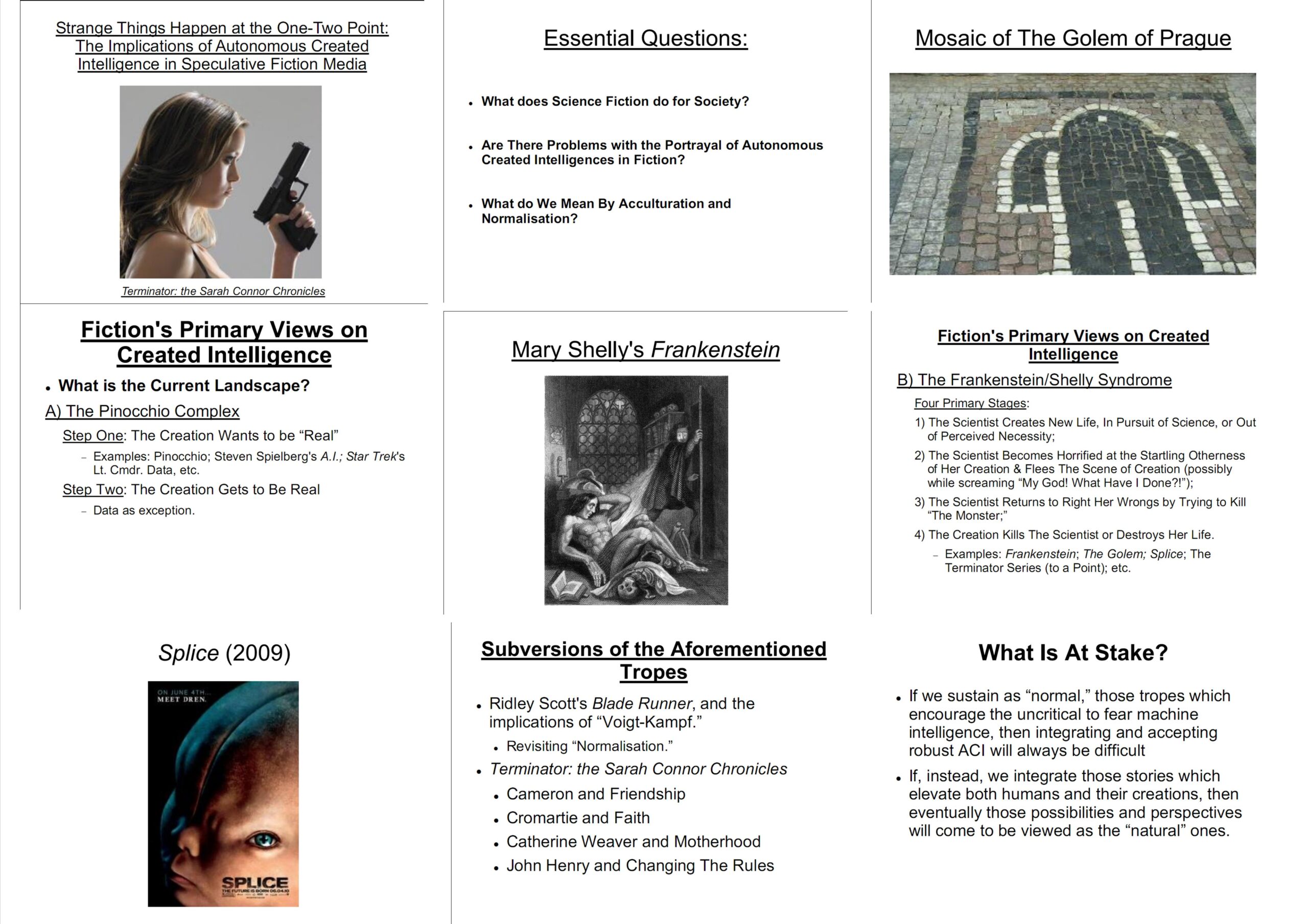 In this work, I make use of specific films, books, and television shows to explore the philosophical and cultural implications of an alternate interpretation of not only Frankenstein, but of the whole of the field of science fiction. In the first part I argue that it isn’t humanity’s attempts to “play god” that cause our failures, but rather our refusal or inability to pay attention to our circumstances, to take responsibility for our creations, and to learn from the warnings and mistakes of those who went before us. Only with this recognition in mind can we move on to accepting and respecting the fundamental otherness of the intelligences we may either create or cause to be created, all while seeking to bridge that otherness, and come to mutual understanding.